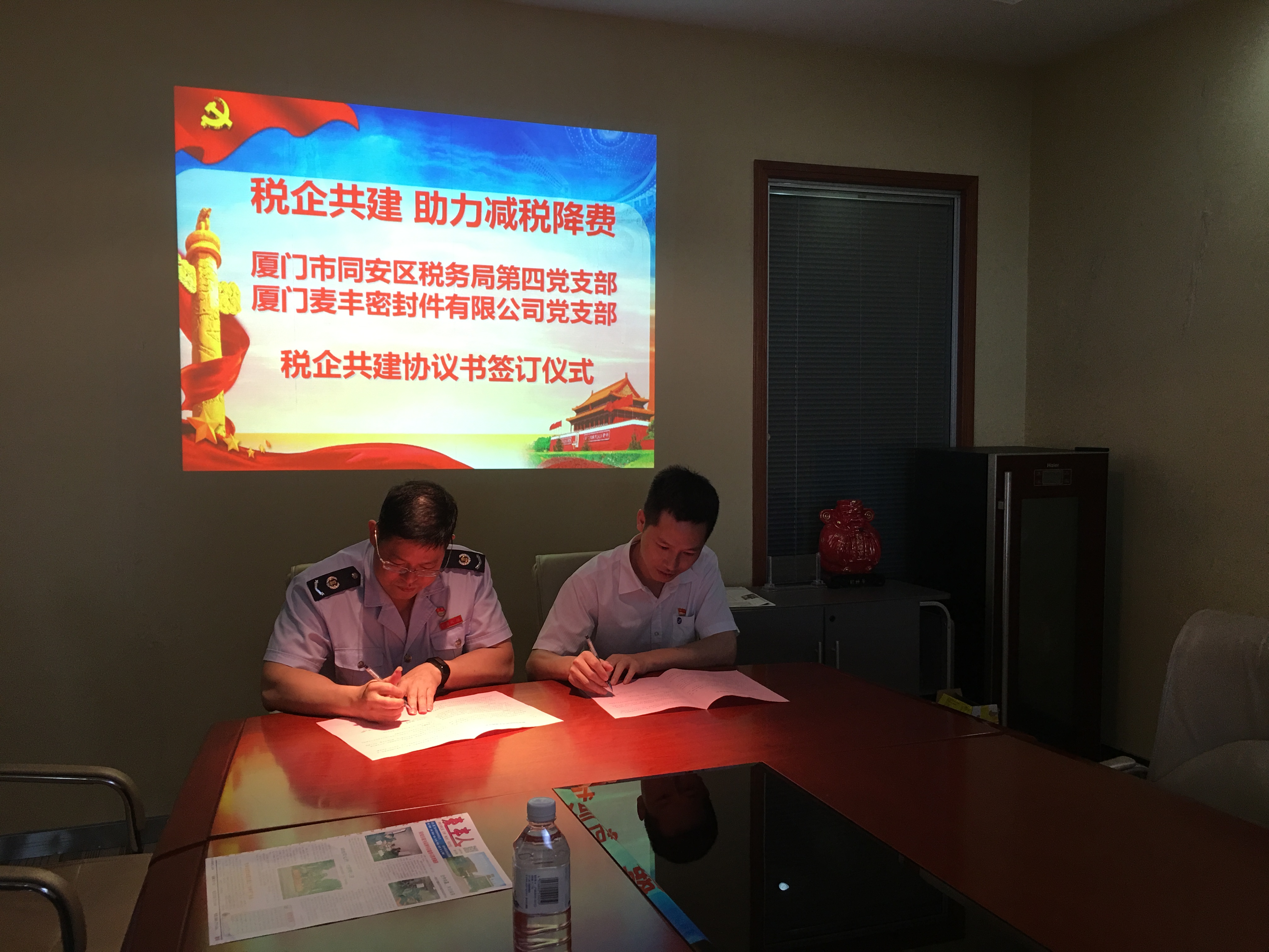 4月25日下午,廈門麥豐密封件有限公司黨支部與同安區(qū)稅務(wù)局第四黨支部進行稅企共建協(xié)議書簽訂。